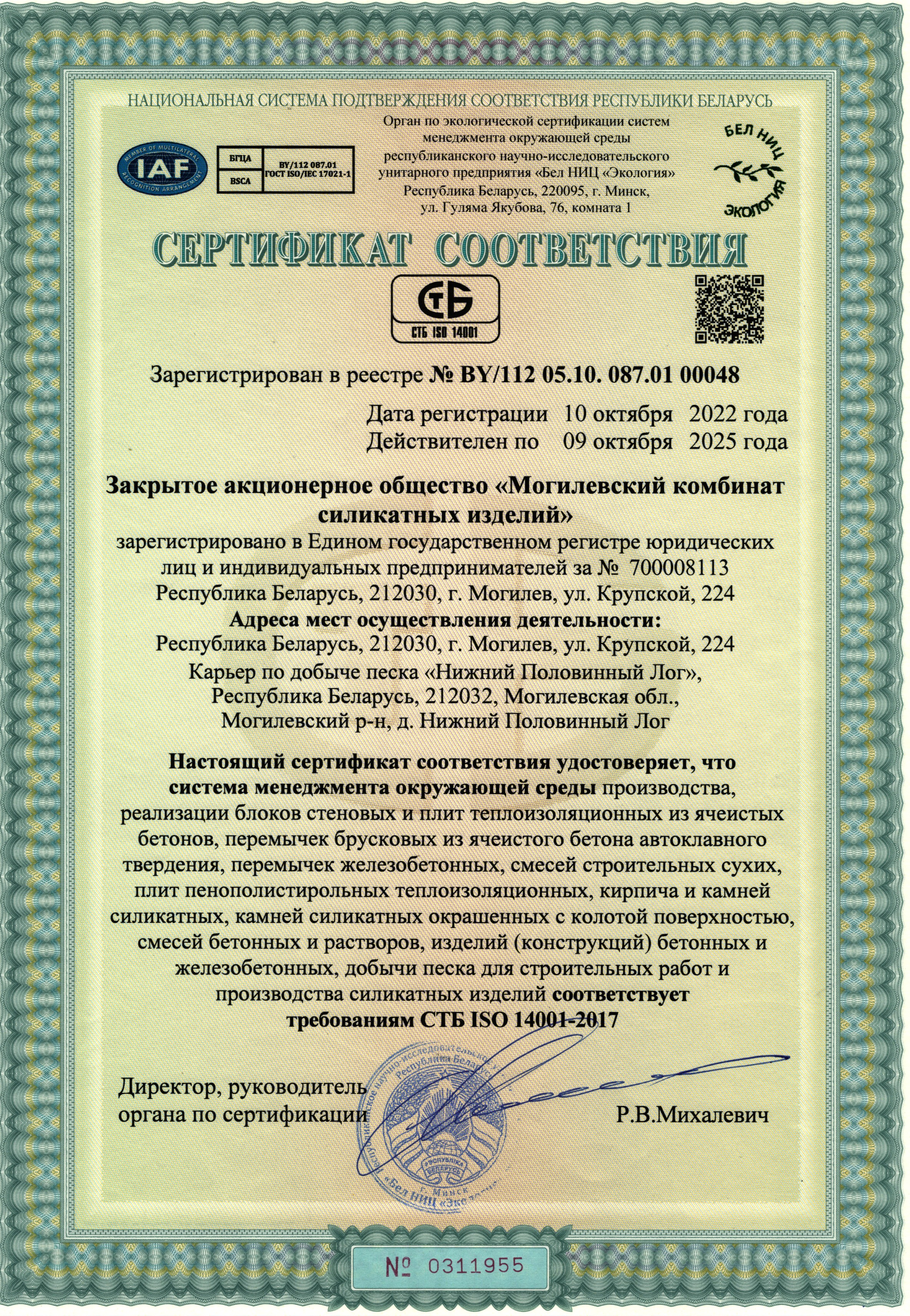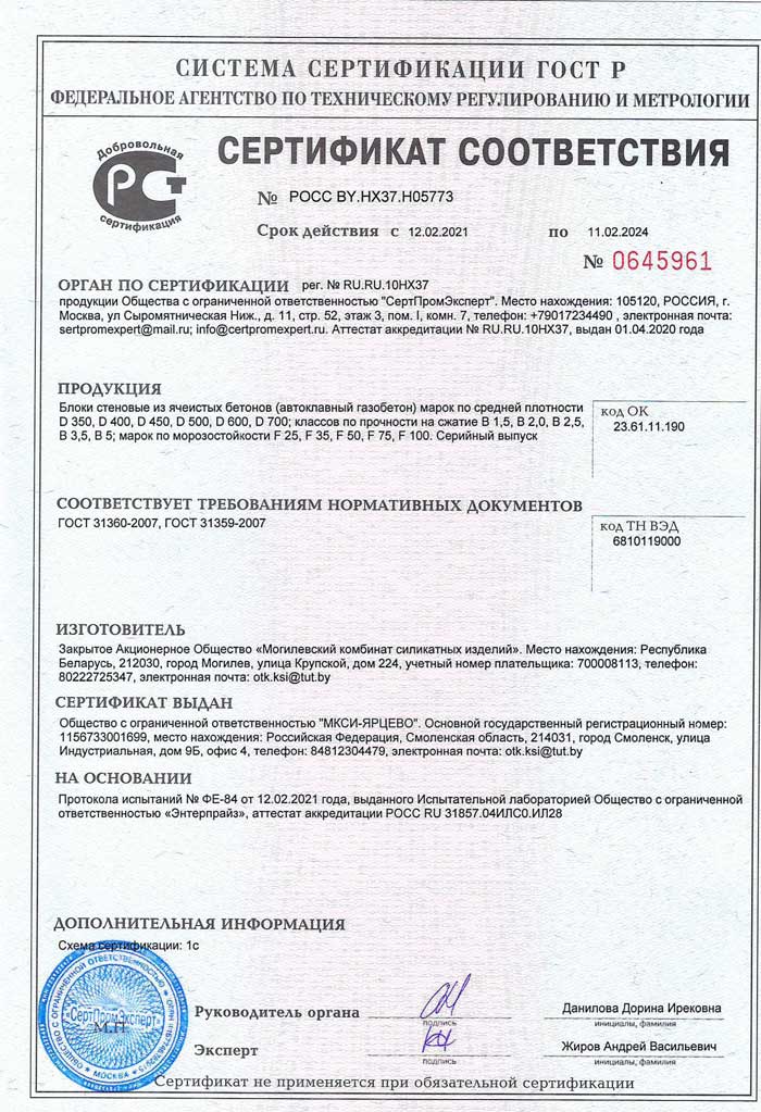 Газобетон Могилевский КСИ D400 100x250x625 мм